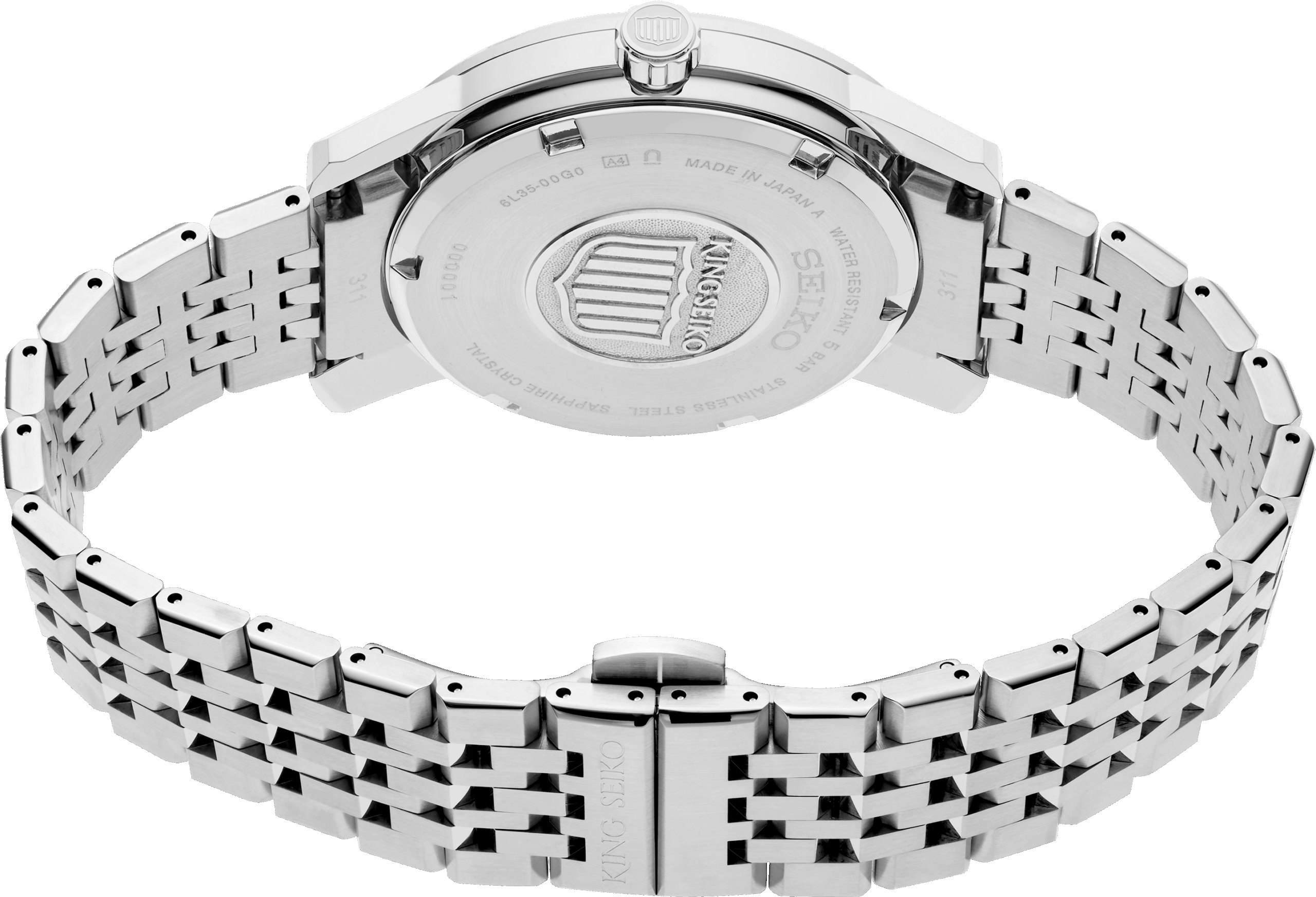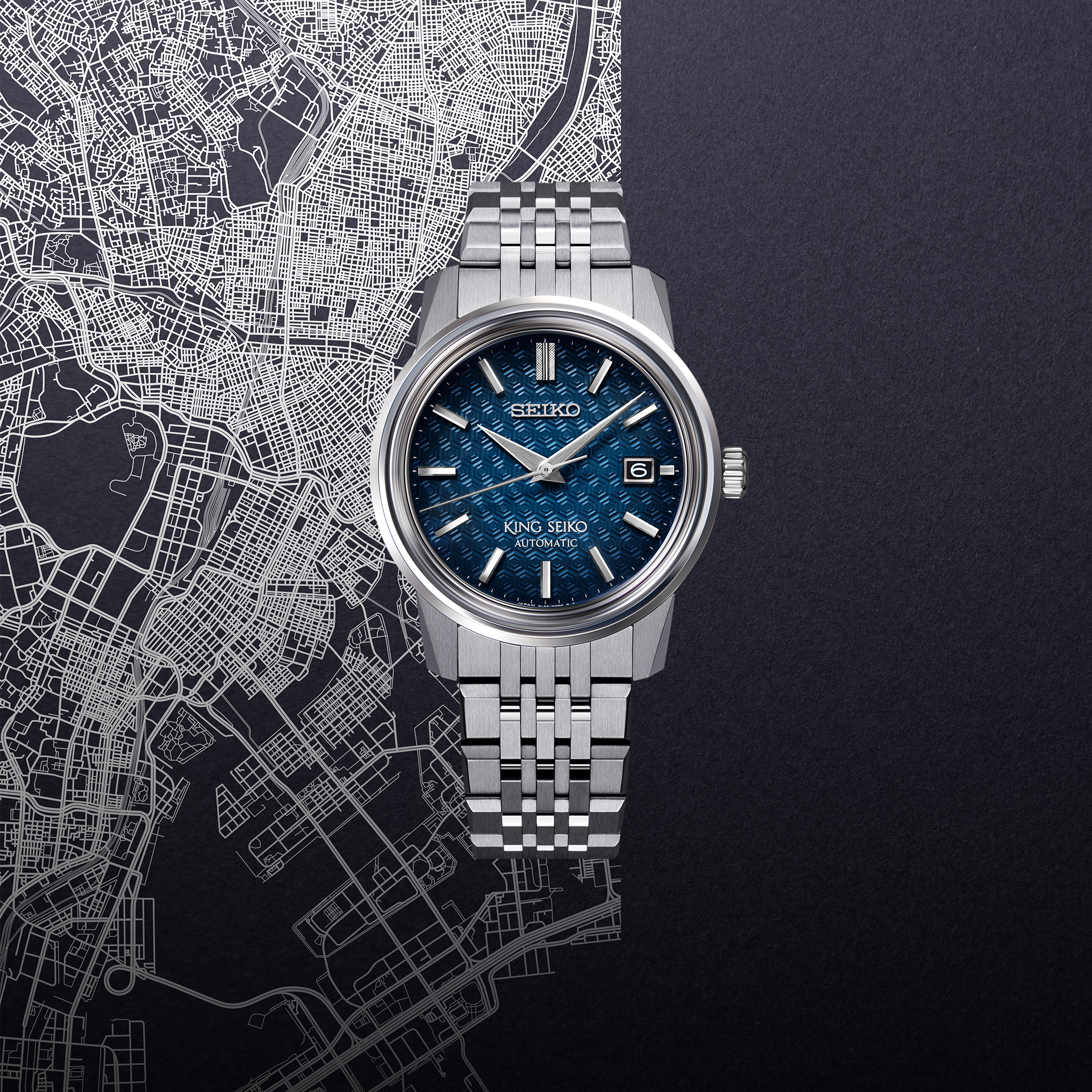 From the King Seiko Collection. First introduced in 1961, King Seiko became one of Seiko’s most technically innovative and stylish brands, noted for its sleek, dignified profile Reflecting traditional aspects of Japanese Ukiyo-e, a genre of art that flourished from the 17th through 19th centuries, the dial of this stunning timepiece expresses “Kameido Blue,” dramatically showcasing a deep blue gradation and a turtle shell pattern, inspired by the turtles in Kameido, Japan, the birthplace of King Seiko. Echoing the 1965 original, the patterned blue dial features diamond cut hands, meticulously cut dimensional indices with a separately carved 12 o’clock marker, and a date calendar. Designed for sophistication and comfort, this elegant timepiece is engineered with a slim 10.7mm case, as well as sharply delineated case and crystal edges. The 26-jewel 6L35 caliber movement, with a frequency of 28,800 vibrations per hour, a power reserve of approximately 45 hours, and manual winding capability, offers such features as a bi-directional winding system and rapid date change mechanism while maintaining a slender profile. Crafted of stainless steel, with super-hard coating and the combination of mirror and hairline finishing characteristic of the original King Seiko, as well as the King Seiko crest on caseback and crown, this elegant timepiece also offers a box shaped sapphire crystal with anti-reflective coating on the inner surface and a deployment clasp with push button release. 5 bar, 50M Water Resistant