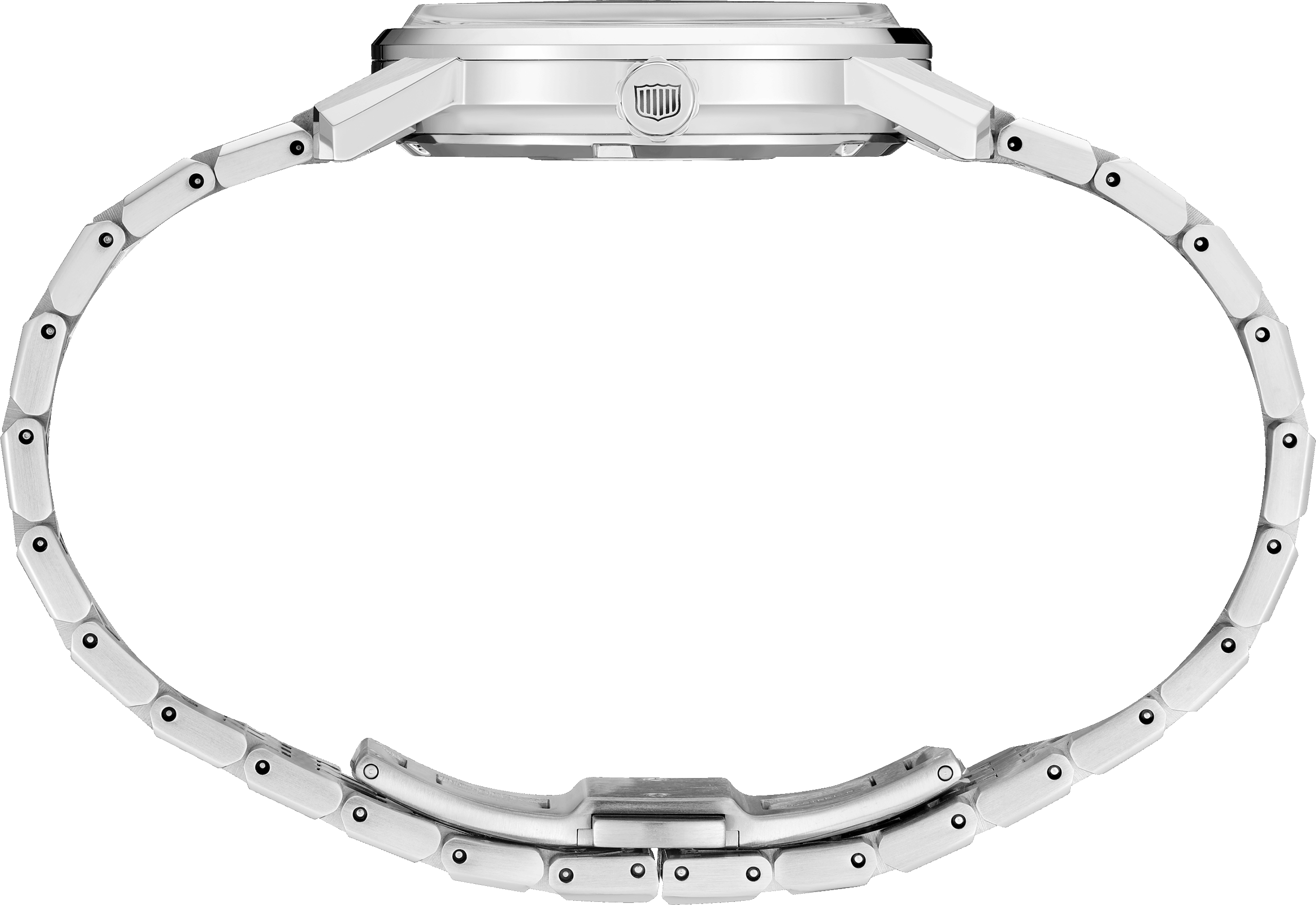 From the King Seiko Collection. First introduced in 1961, King Seiko became one of Seiko’s most technically innovative and stylish brands, noted for its sleek, dignified profile. Inspired by the King Seiko designs from the late 1960s, this elegant timepiece features a specially developed slim case with curved edges to resemble the vintage models, achieving an astounding thickness of only 9.9mm. The 26-jewel 6L35 movement beats at a frequency of 28,800 vibrations per hour with a power reserve of approximately 45 hours and offers manual winding capability and a bi-directional winding system with rapid date change mechanism while maintaining a slim design. Reflecting the city of Tokyo, where tradition and modernity coexist, the green dial evokes Japan’s abundant forests and features a prominent 12 o’clock marker decoratively carved with an arrow feather pattern, a date calendar, and hour and minute hands cut on three sides to provide enhanced beauty and visibility. Crafted of stainless steel, the case flows seamlessly to the multi-row bracelet equipped with impressively narrow links to realize a truly streamlined fit on the wrist. With finishing characteristic of the original collection, this exceptional timepiece displays a King Seiko crest on caseback and crown and includes a box shaped sapphire crystal with anti-reflective coating on the inner surface and a deployment clasp with push-button release. 5 bar, 50M Water Resistant