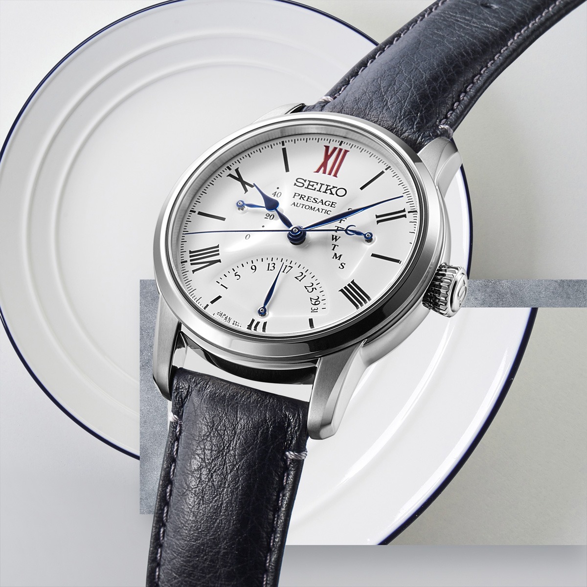 Presage Craftsmanship Series Seiko Watchmaking 110th Anniversary Enamel Dial Limited Edition. To mark 110 years of watchmaking excellence, Seiko is highlighting its continuous dedication to evolving technology, as well as diversity, equality and the sustainable manufacturing necessary to meet environmental challenges. Part of a collection celebrating traditional Japanese crafts, this exquisite Limited Edition, available only in a controlled-production run of 1,500, with the serial number engraved on each caseback, extends the Presage tradition of blending precision technology with superior craftsmanship and design, offering the finest in Japanese mechanical watchmaking with a uniquely Japanese sense of beauty. Honoring enamel artistry, this elegant watch features a hand-crafted pure white enamel dial, ensuring a long-lasting finish while echoing the dial of the 1913 Laurel, Seiko’s – and Japan’s – first wristwatch. Created by master craftsman Mitsuru Yokosawa, the dial expresses gratitude to our predecessors, featuring a red roman numeral at 12 o’clock like the original Laurel and a new design with alternating Roman numerals and indices, as well as both day and date retrograde subdials, and a power reserve indicator. Visible through the screwdown, see-through caseback, the 31-jewel automatic movement beats at a frequency of 28,800 vibrations per hour, with a power reserve of approximately 45 hours and manual winding capability. In stainless steel, with super-hard coating and a new refined and beautifully proportioned case shape, this exceptional design includes a dual-curved anti-reflective sapphire crystal, tri-fold push button release clasp, and a black sustainable leather strap, certified by the Leather Working Group (LWG). Packaged in a Limited Edition collectors’ box. 10 bar, 100M Water Resistant