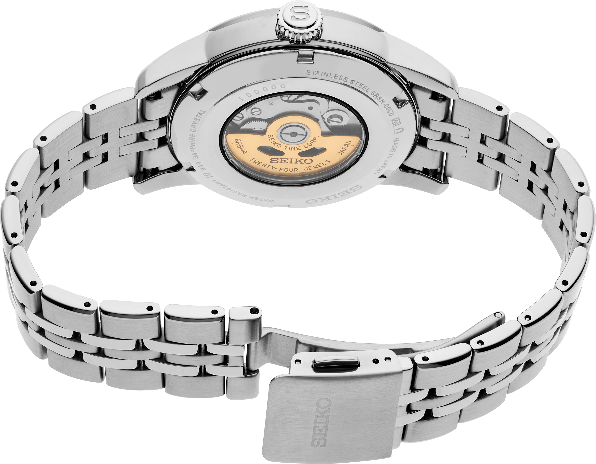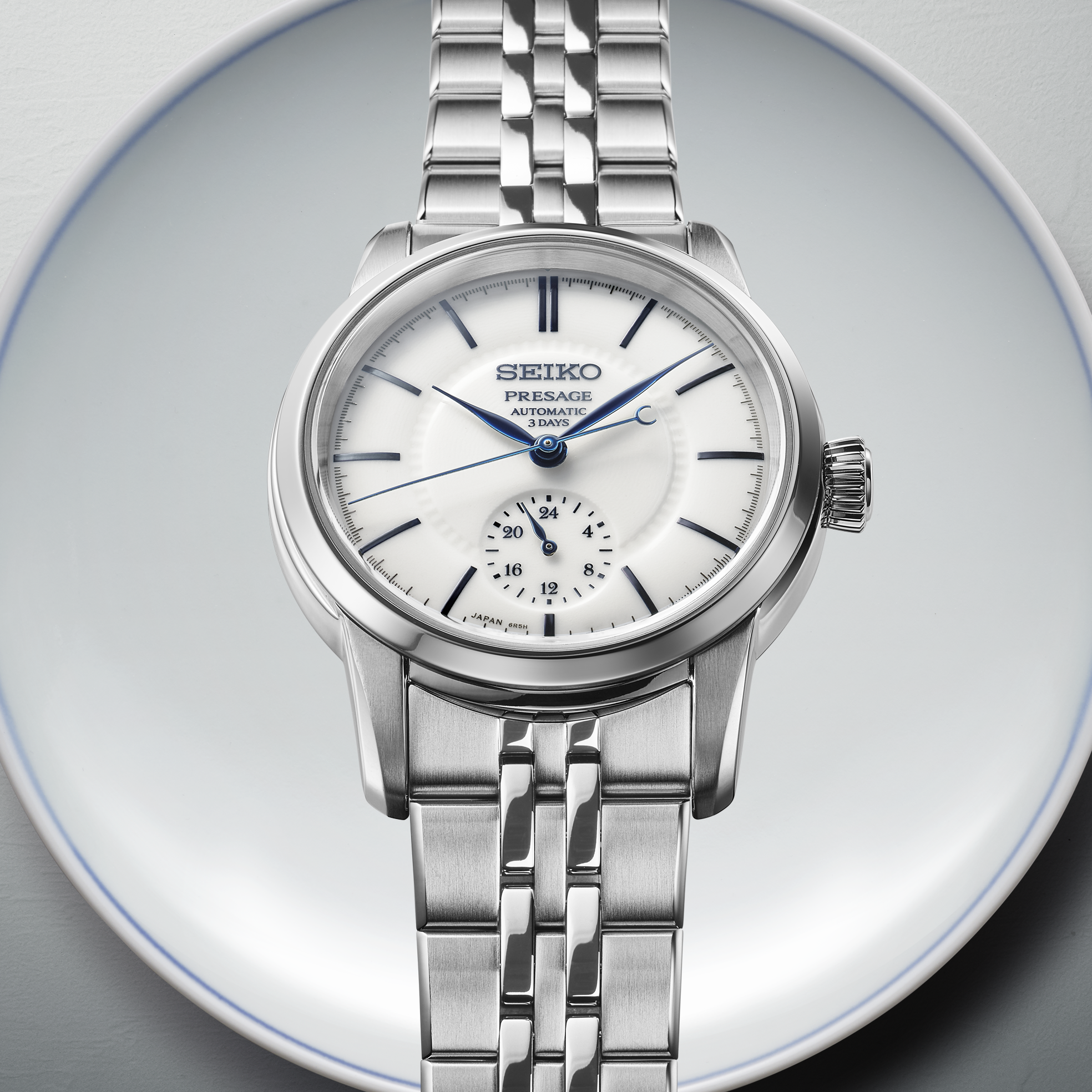 Presage Craftsmanship Series Arita Porcelain. Offering the finest in Japanese mechanical watchmaking, the Presage Collection blends precision technology with superior craftsmanship and design. Arita Porcelain, prized for its unique shades of blue and white, is among the classic expressions of Japanese artistry showcased in the Presage Craftsmanship Series, and is used to create high-strength, three-dimensional dials, individually crafted by master artisans in a multi-step process combining technical innovation with centuries of inspiration. In “Hakuji†(pure white) with blue accents, the beautifully finished dial features a 24-hour subdial at 6 o’clock and employs a subtle pattern on the center section for a three-dimensional effect enhanced by the curved hands and indices providing a soft, luxurious impression. The 24-jewel automatic movement beats at a frequency of 21,600 vibrations per hour, with an approximately 72-hour power reserve and manual winding capability. Crafted of stainless steel with super-hard coating, this extraordinary timepiece includes a dual-curved anti-reflective sapphire crystal and tri-fold push-button release clasp. 5 bar, 100M Water Resistant